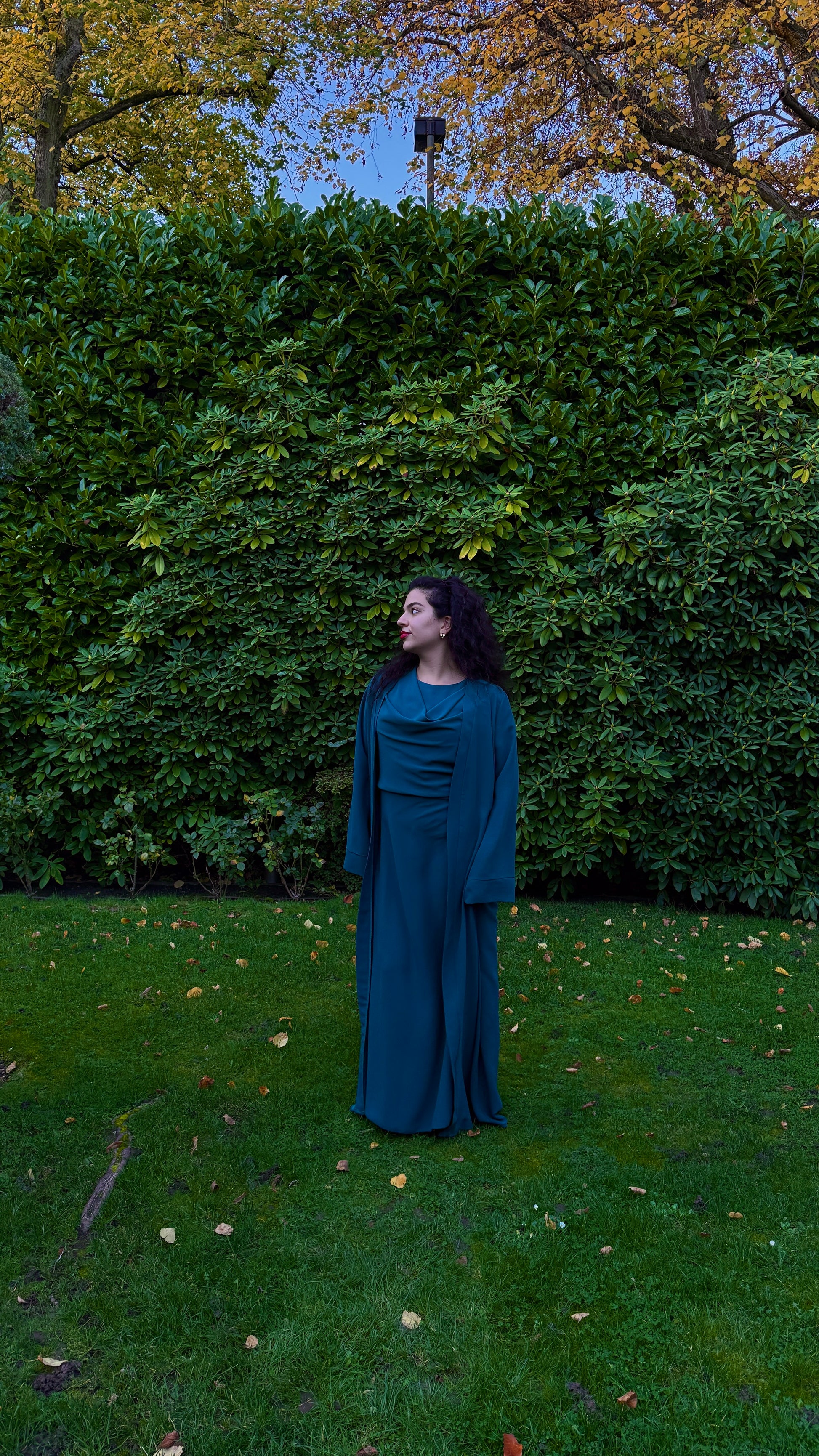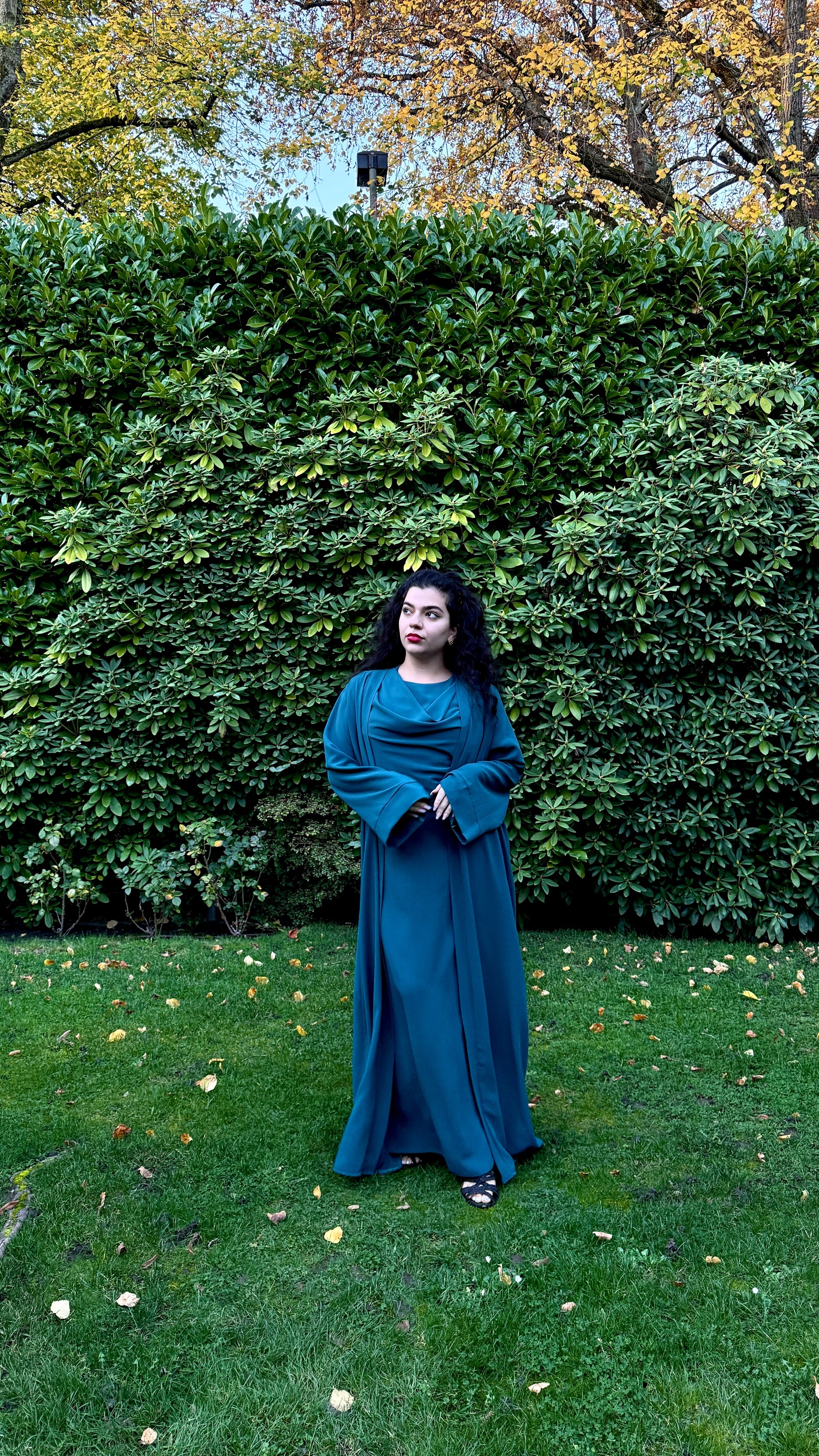 Elevate your modest wardrobe with the Teal Drape Abaya Set from Palais Parnya. This premium two-piece teal abaya and matching dress create a refined, modern silhouette with soft draping and year-round comfort.
